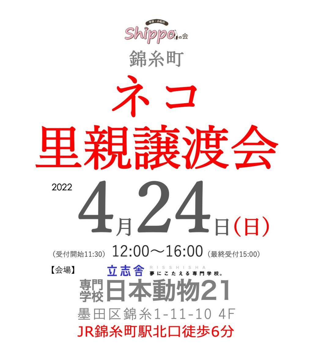 東京 錦糸町の専門学校日本動物21様のご協力により、同校舎にて猫の里親譲渡会を開催させていただきます。