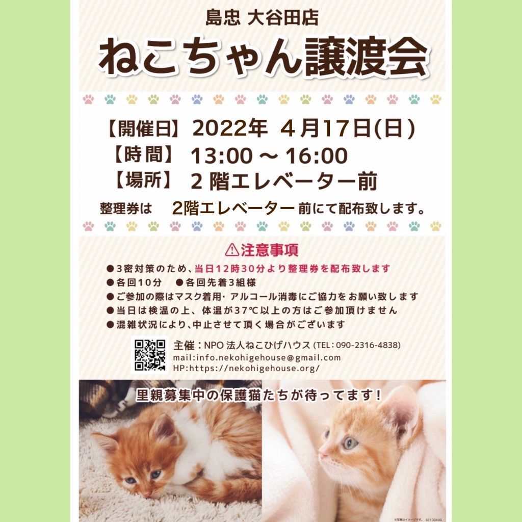 事前にお問い合わせいただき当日は猫を見るだけなども可能です。譲渡会に参加する猫たちは日にちが近くなりましたら、ねこひげハウスのSNSでお知らせを出させていただきます。気になる猫がいましたらお問合せください。