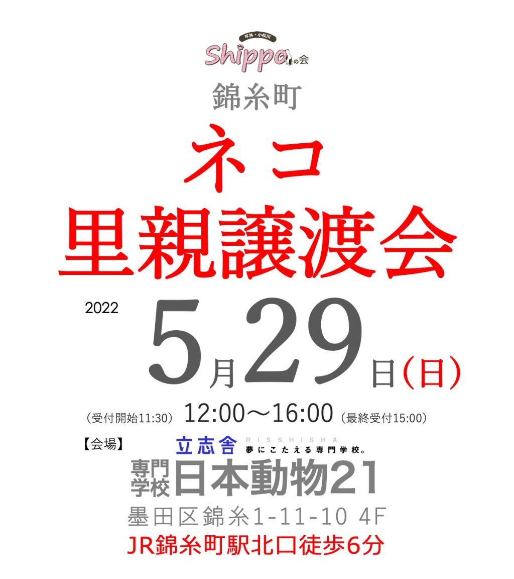 東京 錦糸町の専門学校日本動物21様のご協力により、同校舎にて猫の里親譲渡会を開催させていただきます。
