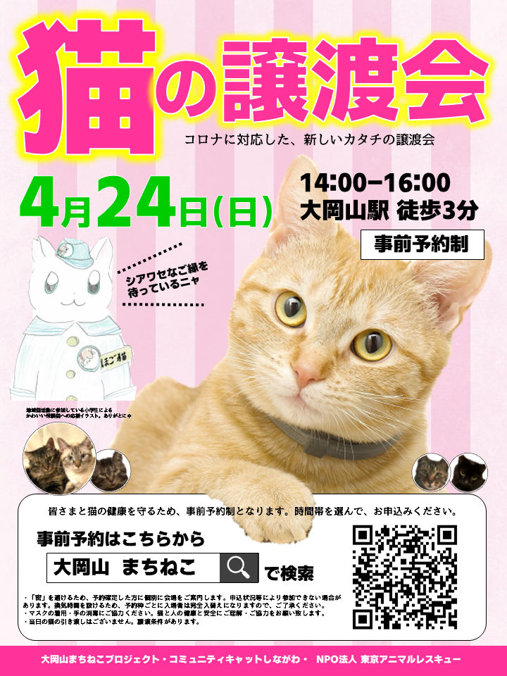 保護猫の譲渡会を行います。たくさんの猫ちゃんたちが幸せな家庭を待っています。ご来場希望の方は、下記より事前にお申し込みくださいますようお願いいたします。コロナ感染対策として、「密」にならないよう、人と猫の安全に配慮して譲渡会を行います。そのため、事前にお申し込みをいただき、人数調整を致します。参加者は東京23区の方のみとなります。お申し込み多数の場合は、品川区大田区を優先して受け付けます。どうかご理解の程、よろしくお願いいたします。