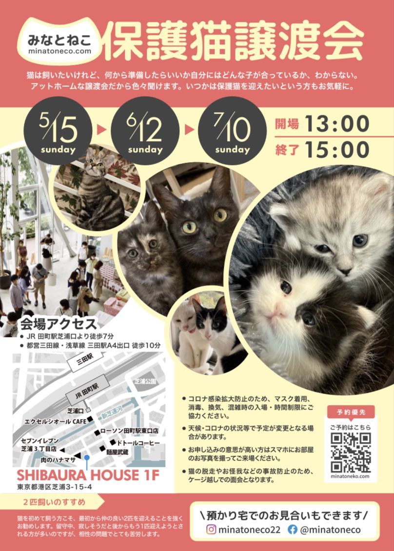 譲渡会のご予約は5/29(日)21:00よりみなとねこのHPよりお願いします